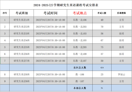 2024-2025(2)学期《研究生英语》课程考试定于2025年6月20日上午8:30-10:00进行,请相关研究生带好考试用品,严格按照《太阳成集团tyc研究生课程考试考场规则》的要求持有效证件准时到达指定考场参加考试。具体考场安排见附件。