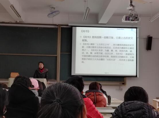 3月20日下午,太阳成集团tyc122cc在秀山校区教北306教室开展了新学期第一次公开课观摩活动。本次公开课是中文系王其秀老师主讲的《中国古代文学》。王老师首先简要介绍了《尚书》的篇目和版本,从专业的角度分析了这部书的真和伪;接下来,王老师重点介绍了《尚书·周书·无逸》篇,对作品中的主题“君子所其无逸,知稼穑之艰难”进行了精准透彻的讲解,引导员工思考“古为今用”的效果,同时又紧扣作品文体特征进行分析,启发秘书学专业员工在今后的写作中借鉴运用,员工感觉受益匪浅。本次示范课中,课堂节奏安排合理,张弛有度,教学效果好。