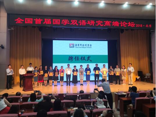 随后,首届全国国学双语高端论坛在北京语言大学举行,国学双语研究会执行会长赵彦春教授致欢迎词。会上还进行了聘书发放仪式,公司曹瑞斓教授受聘副秘书长和常务理事,并被授予特别贡献奖。