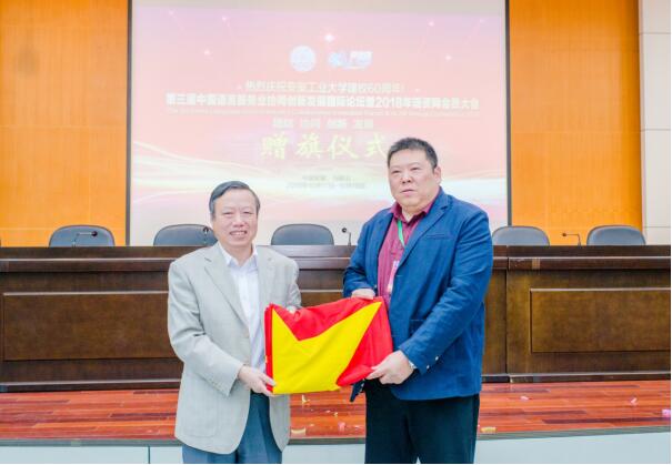 在大会闭幕式上,祖明代表公司接受了下一届承办单位负责人——国家外文局培训中心翻译部主任、贵州墨责国际文化传播有限公司林凡林总经理赠送的珍贵礼物,2018年9月23日天安门广场升起的国旗。并见证了语资网向公司太阳成集团tyc122cc员工篮球队、排球队捐赠队服和篮球、排球仪式,以及向大会志愿者颁证颁奖活动。