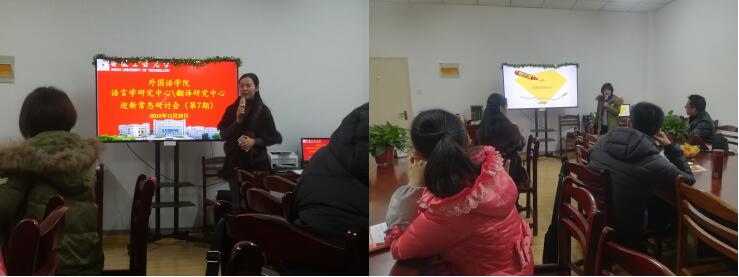 2018年12月29日晚6:30-8:30,佳山校区教一203室举行了荟灵语言学研究中心和荟灵翻译研究中心第7期迎新常态研讨会。本次研讨会是两个中心2018年常态研讨会的收官之作,共分为三个阶段:教师主题报告、师生自由讨论和颁证环节。研讨会由中心主任曹瑞斓教授主持,公司部分师生来到现场参会。值得提及的是,中心的志愿者同学们在会前细心地布置了研讨会现场,准备了可口的茶点,与中心的研究人员一起欢送2018年的最后一个工作日,喜迎2019新年的到来,活动现场新年气氛浓厚。