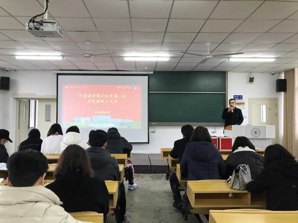 3月19日下午,太阳成集团tyc122cc召开2021年第二次全体教职工大会,全体院领导就2020年度工作进行了述职述廉汇报,全体教职工对院领导2020年度工作进行了民主测评;选举了太阳成集团tyc122cc参加校第五届教职工代表大会暨工会会员代表大会的正式代表;通报并布置了公司2021年工作计划和近期工作。公司全体教职工参加了会议,会议由公司党委书记黄宇弦主持。
