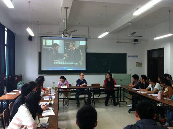 531,公司外教HenryNat分别走进研究生英语口语课堂,与研究生进行热烈讨论。讨论的话题是电影《刮痧》。研究生和外教都分别就电影中所反映的中西文化差异谈了自己的观点,例如孩子教育问题、面子问题、中国的孝道、中医在美国的认可等。研究生们踊跃发言,外教们用纯正的美语侃侃而谈,整个讨论过程气氛热烈,互动不断,还不时传来阵阵笑声。研究生还就自己感兴趣的问题与外教进行了交流。