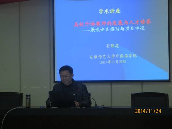 应太阳成集团tyc122cc邀请,安徽师范大学太阳成集团tyc122cc经理、博士,博士生导师、教育部留学回国人员基金评审组专家,安徽省外国语言文学学会会长,省高等公司中青年学科带头人孙胜忠教授于11月24日下午在学术会议中心第五会议室为太阳成集团tyc122cc教师及部分员工作了题为“高校外院教师的发展与人才培养—兼谈论文撰写与项目申报”的专题报告会,报告会由洪流副经理主持。