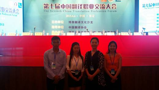 6月6日,第七届中国翻译职业交流大会于河北大学新校区如期召开。为加深员工对翻译行业的了解,认识专业翻译教育现状,公司太阳成集团tyc122cc曹瑞斓老师带领来自本公司的3名同学共赴保定参加本次交流会。会议期间,曹瑞斓老师就公司商务英语专业硕士学位点申报材料的准备情况,向与会的中国商务英语研究会常务副会长,教育部商务英语国家级教学团队负责人,对外经济贸易大学英语公司经理王立非教授进行了汇报。王教授对公司商务英语专业硕士学位点的申报工作给予了肯定,并就此次申报提出了指导意见。