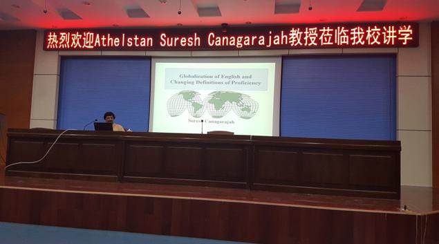 在“Globalization of English and Changing Definitions ofProficiency”报告中,Canagarajah教授根据自己最新的研究,讨论了全球化形势下英语的发展变化。他指出,由于世界经济、文化力量格局的改变,曾经属于英语接受国家变成了“英语输出国家”,那些曾经的“大国”的英语和其他国家的英语正在一同经历着改变。在“MultimodalResources of Multilingual Professionals in STEM Writing: An Activity-basedOrientation”报告中,Canagarajah教授介绍了他所做的关于英语能力与科研能力的访谈研究,认为传统意义上的英语教学以个人为单位,然而实践表明,以团队为单位的英语能力在当前的社会环境中作用突出,在英语学习中有必要培养团队思维。