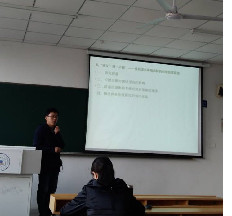 朱军老师结合自己的访学经历,作了题为“从‘格义’到‘不翻’——佛经译名策略选择的伦理因素探微”的讲座。朱老师首先解释了佛经译名策略经历了从两汉魏晋的“格义”到隋唐时期的“不翻”的过程,接着他通过各种伦理因素对佛经译名的影响,总结了佛经译名策略经的嬗变历程——求同、存异、和而不同。