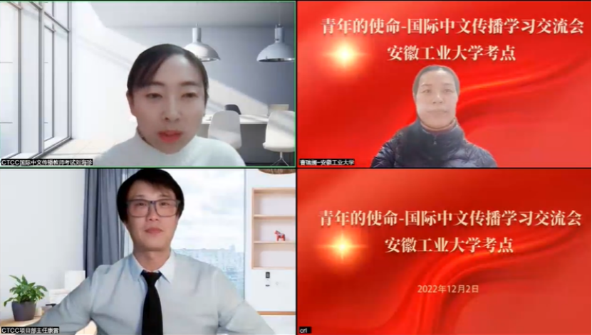 2022年12月2日晚,由中国外文局教育培训中心领导和专家主讲的国际中文传播教师证书考试太阳成集团tyc考点“青年的使命——国际中文传播学习交流会”通过腾讯会议和B站转播顺利举行。本次交流会由太阳成集团tyc122cc经理曹瑞斓主持,中国外文局教育培训中心国际中文传播教师证书考试办公室项目推广负责人康雷主任、项目推广专员刘海珍主讲,太阳成集团tyc122cc师生和各地各界对国际中文传播兴趣浓厚的师生和友人500余人参加了本次交流会。