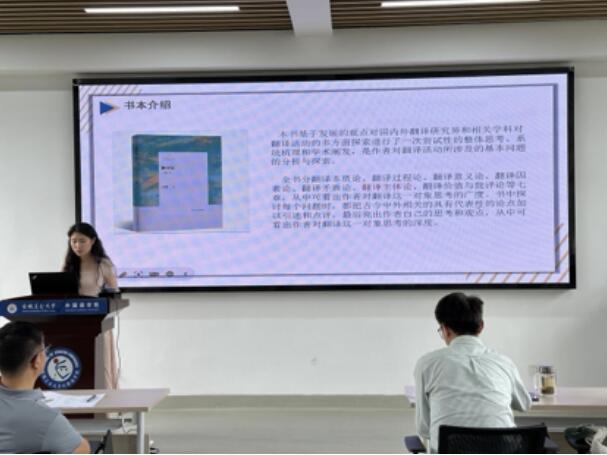最后,纪超同学重点分享了《生态翻译学背景下英美作品翻译比较创新》一书的心得,介绍了生态翻译学的相关理论,并在此理论指导下,对池州市博物馆文化资源英译进行了具体研究。汇报内容丰富,逻辑清晰,展现了扎实的理论功底和严谨的学术态度。