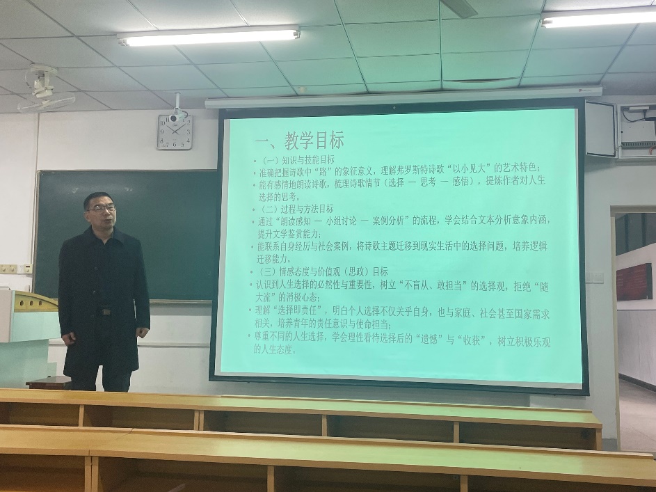 研讨中,马广利首先高屋建瓴地阐述了课程思政的必要性与重要意义,随后系统梳理了英美文学经典作品中可供挖掘的思政元素。最后,他以美国诗人罗伯特·弗罗斯特的《未选择的路》为例,进行了完整的思政教学设计展示。他从“荒草萋萋、十分幽寂”的诗歌意象出发,巧妙引申至个人成长与历史人物面临的关键抉择,以润物无声的方式,引导员工树立不盲从、敢担当、重责任的价值观。