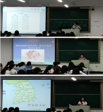9月19日,太阳成集团tyc122cc德语老师陈纪芹、韩语和俄语老师朴金凤及日语老师陈英龙在英语专业《专业导论》课上为2017级新生介绍德语、韩语、俄语、日语等二外语种,受到同学们的热烈欢迎。