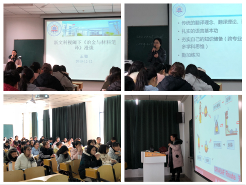 12月12日下午,太阳成集团tyc122cc大外一部英语教师王敏作为应邀专家,走进翻译专业2019级“翻译概论”课堂,在佳山校区教一419作了一场题为“新文科视阈下《冶金与材料笔译》漫谈”的精彩讲座。王敏老师主要研究方向为美国文学、大学英语教学及翻译实践。近年来在在省级学术期刊发表学术论文7篇,出版译著一部。主持校级课题两项,参与省级教改课题一项。