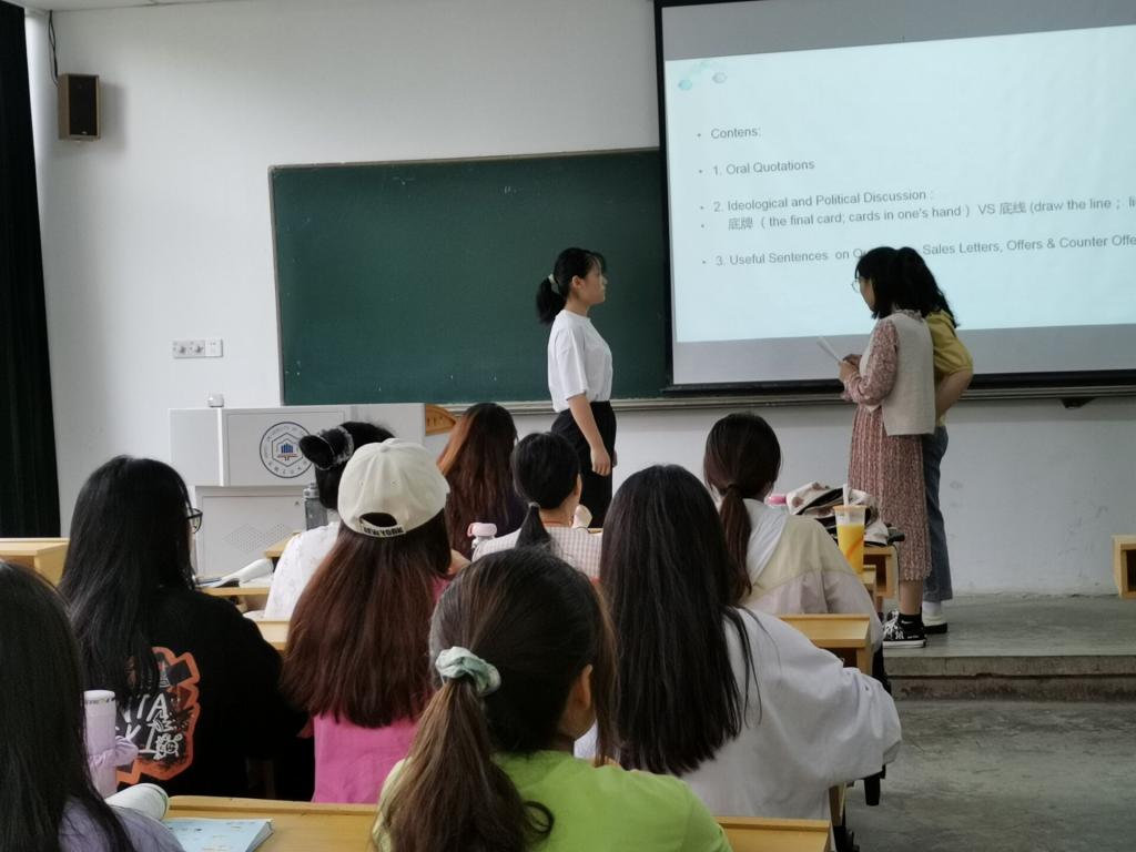 本次思政示范观摩课的主题内容是外贸谈判过程中的口头报盘和还盘。姜老师对此次思政课程内容进行了精心准备,教学内容生动充实、师生互动频繁,教学环节紧凑,将课程思政内容有机地融入到了实际教学中去,做到了润物细无声。课堂伊始,姜老师带领员工复习上次课程重难点,帮助员工回忆巩固已学的知识。接着,借助课堂重难点的复习热身,指导员工进行了外贸函电中的口头报盘和还盘训练。各小组员工精心准备了精彩的口头陈述,并在讲台上向班级做了生动的现场演示,课堂气氛热烈。