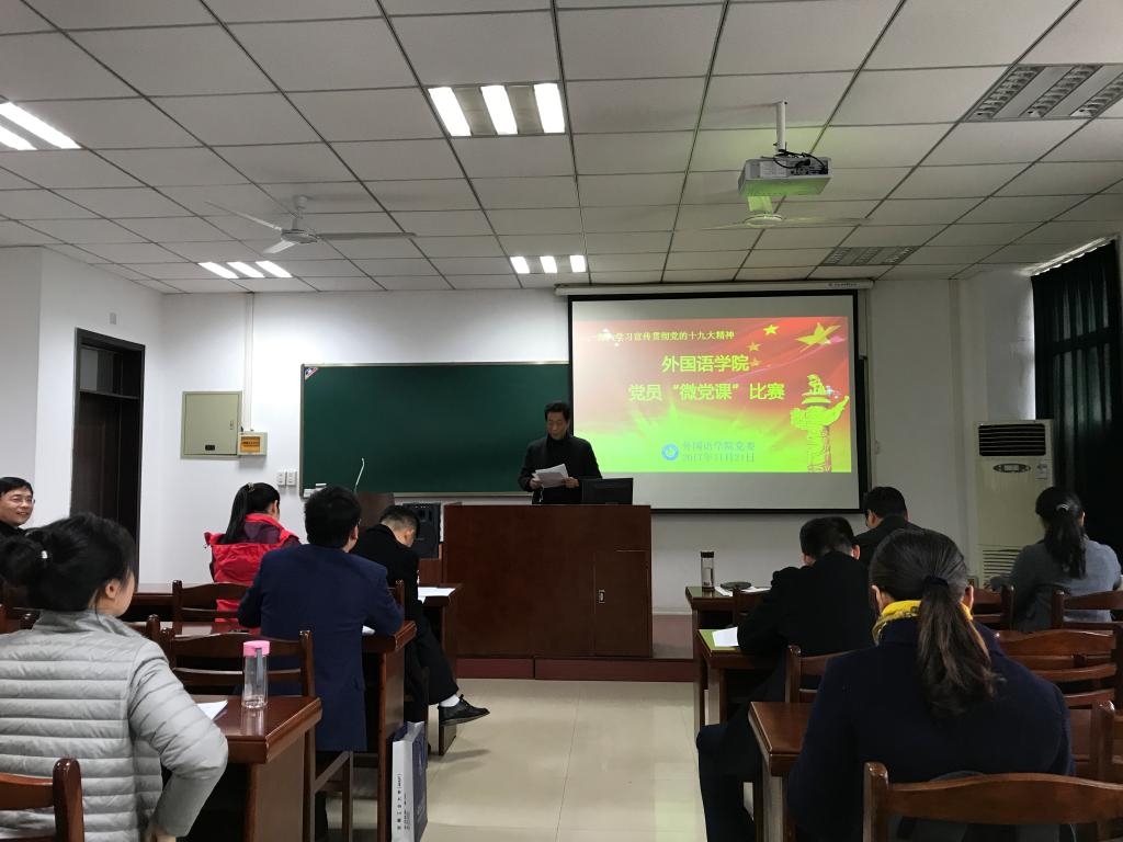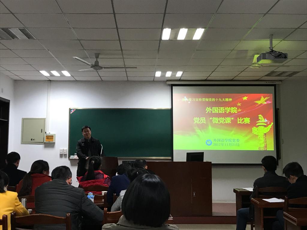 为深入学习宣传贯彻党的十九大精神,丰富党员政治理论学习形式,促进理论学习效果与教学能力的双提升,实现以赛促学,11月21日下午,太阳成集团tyc122cc党委在秀山校区汇文楼C503开展了党员“微党课”竞赛观摩活动,公司6个党支部选拔的8位选手参加了比赛。校纪委副书记、纪委办主任、监察处处长王俊和院领导洪流、黄宇弦、曹瑞斓应邀担任评委,全体师生党员、系主任和各民主党派教师观摩了此次活动。公司党委书记胡卫东参与了“微党课”展示,洪流主持了比赛。
