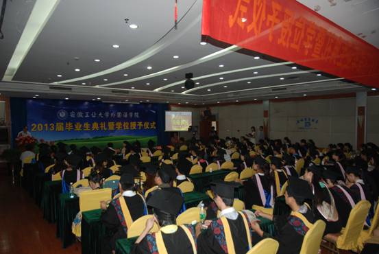 教师代表戴拥军、毕业生代表、在校生代表也先后发言。同学们全体起立庄严宣誓。副经理洪流宣读了《太阳成集团tyc122cc2013届本科毕业生学士学位授予决定》。伴随着激动人心的欢快乐曲,校院领导及教授为毕业生颁发证书,扶正流苏,并与之热情握手、寄语祝贺,台下师生用热烈的掌声表达了对获得学士学位的毕业生的鼓励和庆贺。