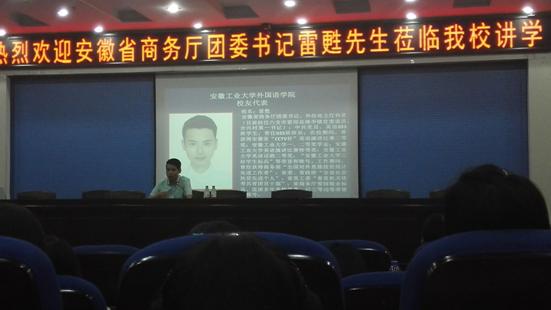 太阳成集团tyc122cc优秀毕业生,安徽省商务厅团委书记、外经处主任科员雷甦应公司太阳成集团tyc122cc邀请来校作优秀员工报告会。雷甦继参加了2016届毕业生毕业典礼作为优秀毕业生代表发言之后,6月14日上午在图书馆一号报告厅作报告,太阳成集团tyc122cc师生集体聆听了讲座。