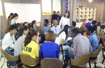 在主题演讲环节中,同学们激情洋溢,用热烈的掌声迎接外国友人的到来,对本次活动充满了期待。国际教育公司和太阳成集团tyc122cc的4个代表组分别围绕非洲历史、中国美食、孟加拉体育和中国服饰四个主题进行汇报展示,将现场的观众们带到交流的氛围中。从小组主题演讲到主题讨论汇报。同学们积极参与,主动发言。中外老员工间的愉快交流使得活动现场热闹非凡。