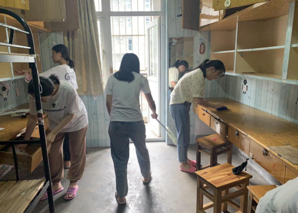 扫地、擦桌子、扔垃圾、整理柜子……经过两个多小时的打扫,原本积满灰尘的宿舍变得窗明几净。一尘不染的地面,干净整洁的桌面,宽敞明亮的房间。室外有设备齐全的开水间,窗外有郁郁葱葱的树木,走廊的两端有干净明朗的水房,宿舍里整洁宽敞,共同迎接新同学们的到来。