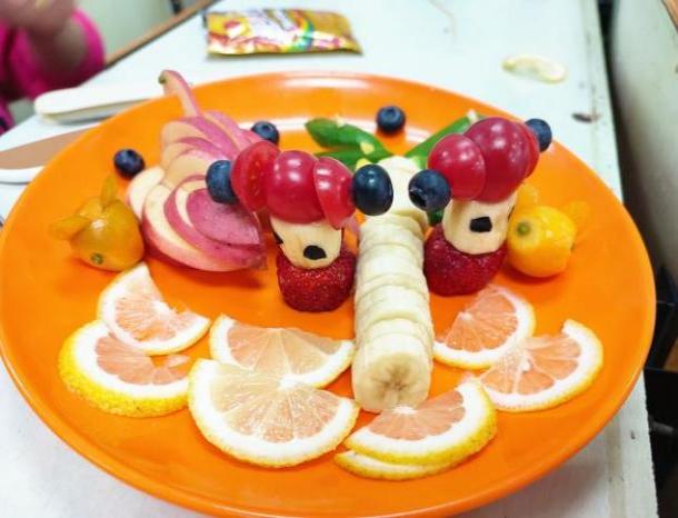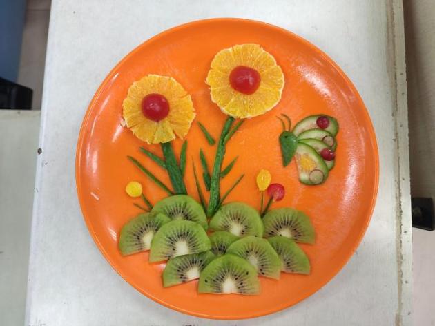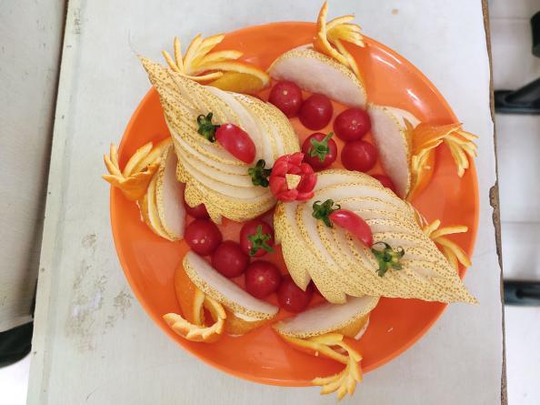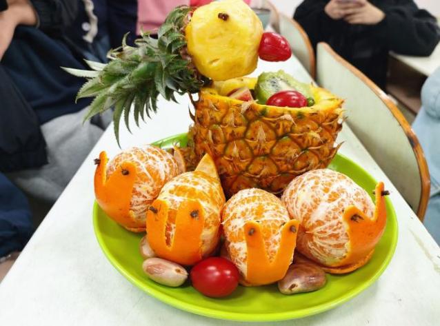 比赛过程中,各组参赛队员首先构思好各自拼盘的结构与形态,然后分工协作,水果在同学们的手中不断地被精雕细琢,最终拼成了各色各样的水果拼盘。其中,呈祥锦鲤、阳光兔子、春花浪漫等作品,巧用时令果蔬表达了美好祝愿,创意新颖,给观众和评委留下了深刻印象。
