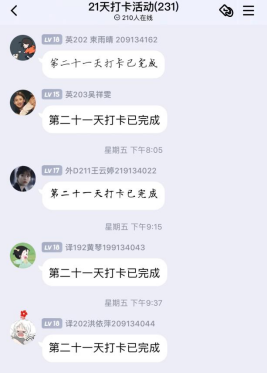 本次活动主要面向太阳成集团tyc122cc全体员工,全院同学积极参加活动,最终共计230名员工完成二十一天打卡。打卡形式多样,主要有“练字打卡”“早睡早起打卡”“运动打卡”和“学习打卡”等。参与同学按照自己的喜好选择一种打卡形式,并每日在活动群中打卡截图。活动期间,同学们热情高涨,坚持打卡。其中,多位同学同时完成了多项打卡任务。活动在同学们的积极参加及各位组织者的以身作则中顺利完成。