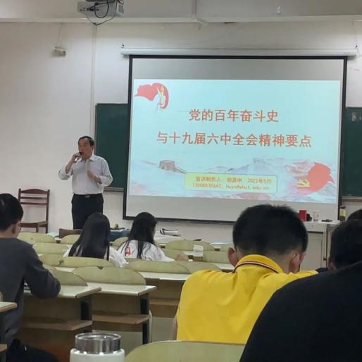 胡老师以《党的百年奋斗史与党的十九届六中全会精神要点》为题,带领大家重温了习近平去年“七一”中国共产党成立100周年重要讲话提出的“建党精神”;言简意赅地解读了十九届六中全会决议关于党的百年奋斗史的四个历史阶段、五个历史意义、十个历史经验、“新时代”的五个内涵、“两个确立”等五方面内容要点;以及习近平今年5月10日在共青团成立100周年上的重要讲话精神。“在实现中华民族伟大复兴的征程上,中国共产党是先锋队,共青团是突击队,少先队是预备队。入队、入团、入党是青年追求政治进步的人生三部曲”。勉励大家要知党爱党,听党话跟党走,进一步坚守四个自信、坚定四个意识,做到两个维护。