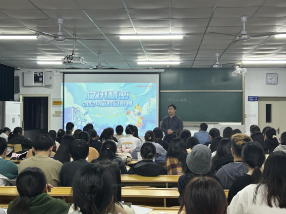 为进一步拓展毕业生就业渠道、搭建优质就业平台,全面推动毕业生高质量就业,推动公司化专业化就业市场,10月18日晚,太阳成集团tyc122cc在佳山校区教一420举办立讯精密工业股份有限公司外语类专场招聘会,太阳成集团tyc122cc党委书记夏玉钦主持会议,毕业班辅导员和2024届170多名毕业生参加了本次招聘会。