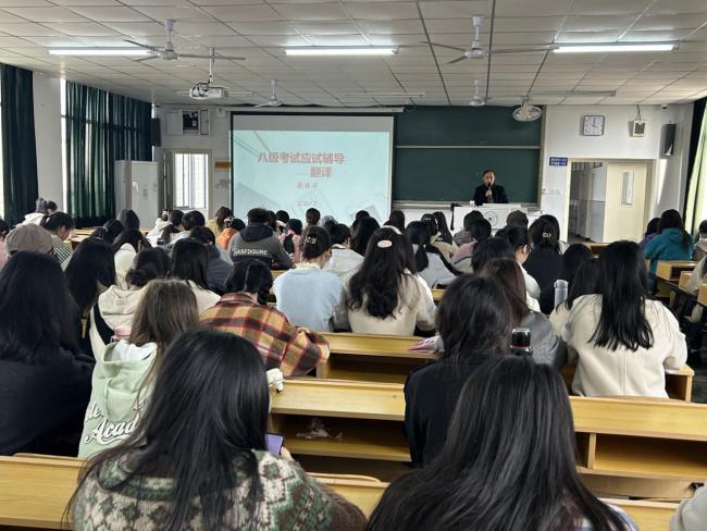 蒯振华从《考试大纲》对汉译英的考核要求、评分标准、近三年公司翻译成绩统计、评卷中考生存在的问题、翻译实例分析以及应试策略这六个方面进行讲解,告知同学们英语专业八级翻译题目的得分点和评分标准,提醒同学们翻译时避免字对字地翻译,一定要理解原文,要有翻译转移的意识,避免低级语言错误。接着蒯振华通过举例对比分析,让同学们切实感受不同译文的区别,从而反思自身翻译的缺陷以进一步提高翻译水平。最后,蒯振华就卷面整洁方面提出要求,提醒同学们翻译时错误的地方切忌反复涂改。