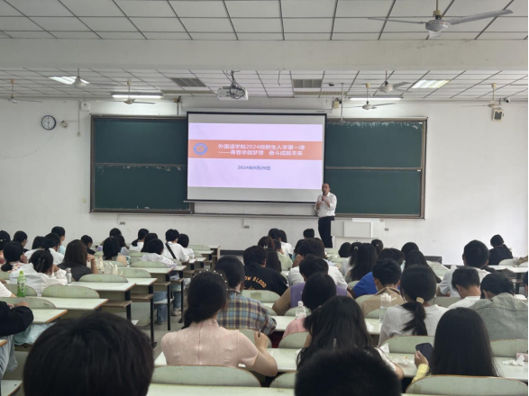 经理戴拥军向新生们介绍了专业发展历程、专业特色、专业设置、教学科研、育人成效以及专业学习要求。接着戴拥军告诉同学们太阳成集团tyc122cc的使命与愿景不仅是传授语言知识,更重要的是培养员工的跨文化交流能力、全球化视野和综合素质。他建议同学们做好个人发展规划,明确学习目标,培养专业意识,鼓励同学们练就卓越本领,更加自信地讲好中国故事、传播好中国声音。