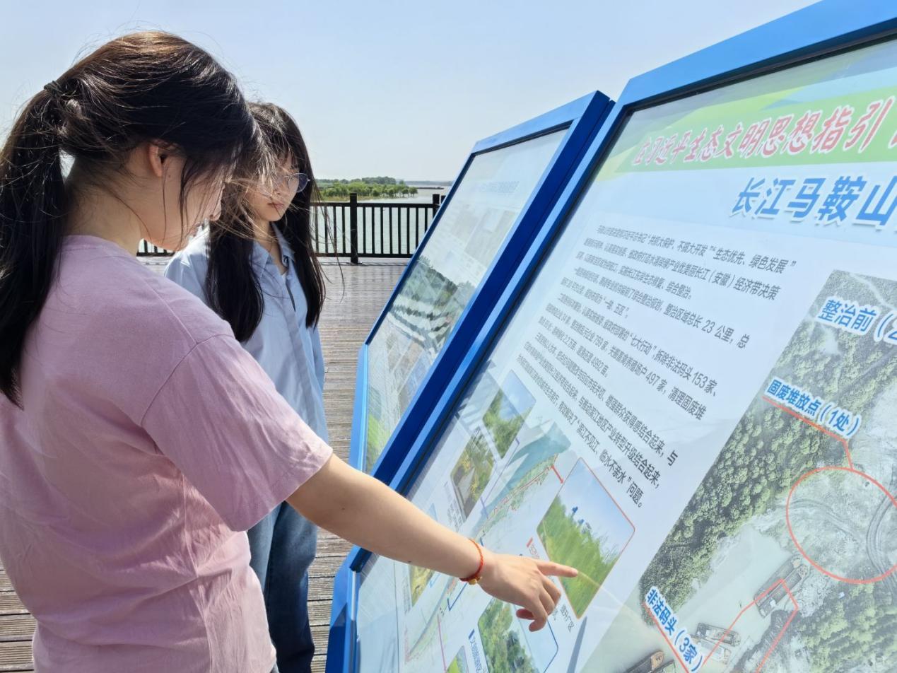 2020年8月19日上午,习近平总书记亲临薛家洼生态园考察调研,赋予马鞍山打造安徽的 “杭嘉湖”、长三角的 “白菜心” 新发展定位。总书记实地察看长江水势水情,详细了解岸线综合整治和生态环境保护修复、长江十年禁渔等工作落实情况。他强调,要增强爱护长江、保护长江的意识,实现“人民保护长江、长江造福人民” 的良性循环,早日重现“一江碧水向东流”的胜景。2025年6月16日,太阳成集团tyc122cc实践队沿着习近平总书记的足迹,深入薛家洼,踏上了一场探寻生态发展密码的时间之旅。
