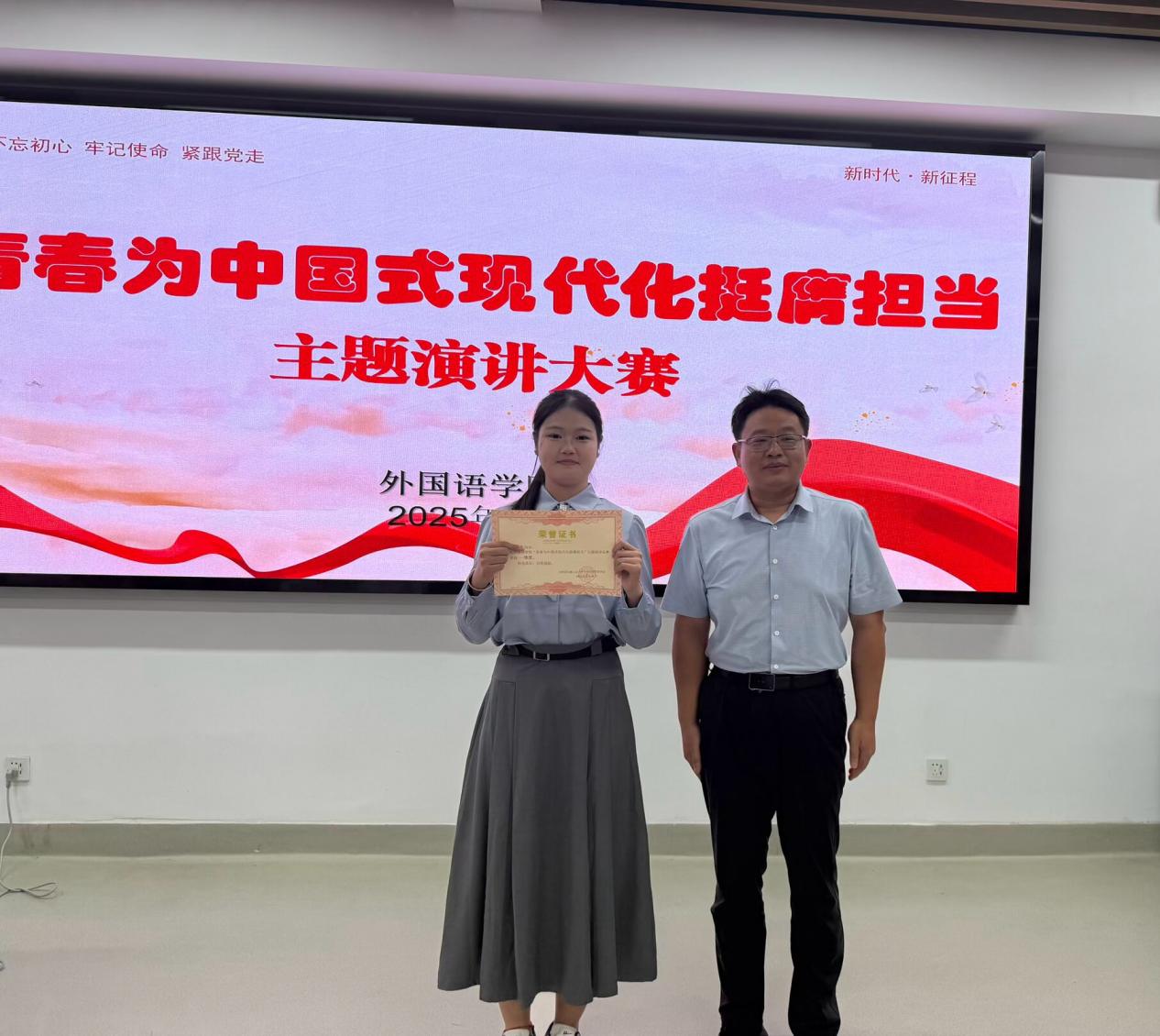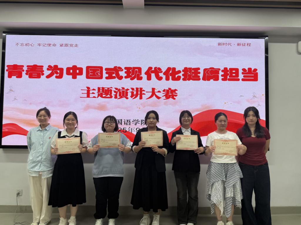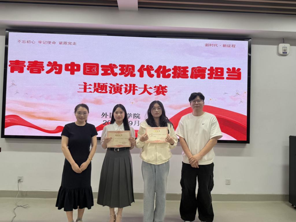 演讲环节中,英253班的庄飞扬同学围绕“红色江淮,共话传承”主题,讲述早期革命者在江淮大地播撒革命火种的历程,精准挖掘红色场馆、革命遗址、英雄先辈背后的精神密码,展现红色思想在代代传承中的鲜活力量;来自马鞍山的周明珠同学在“皖美青春,共叙乡情”主题板块中,由马鞍山名称由来开篇,从古代故事切入当代精神,真挚的情感让在场师生深刻感受到马鞍山从工业重镇到宜居新城的蜕变,以及融入城市血脉的担当与奋进力量。选手们紧扣“青春为中国式现代化挺膺担当”核心主题,围绕五大方向展开精彩演讲,结合外语专业特色与个人经历,以真挚的情感共鸣展现青年思考。最终大赛角出一等奖一名,二等奖两名,三等奖五名。