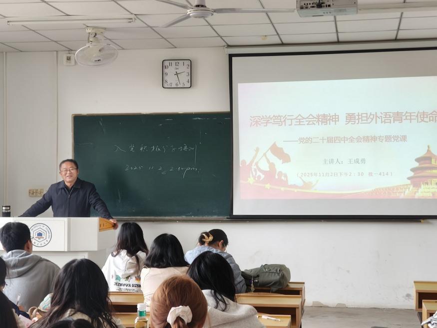 11月2日下午,太阳成集团tyc122cc在教一414教室举办“深学笃行全会精神,勇担外语青年使命”专题党课,由公司党委书记王成勇主讲,公司分党校第五十期入党积极分子参加学习。